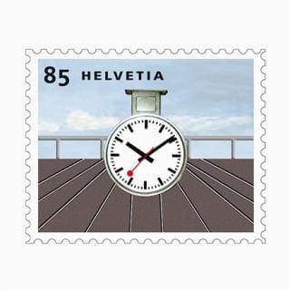 This Swiss stamp featuring a MONDAINE face was designed by Ursus Wehrli for the Swiss Post.