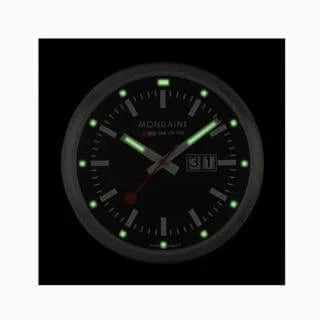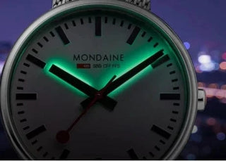 Life doesn’t stop at night – the MONDAINE Backlight Technology allows good visibility of the hands at night, without any disturbing visual effect of the design. The thin luminous foil with Swiss-made, extra strong Superluminova material is painted on the back side of the watch hands.