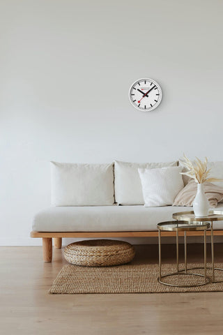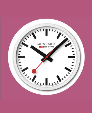 Designed in 1944 and recognized worldwide, the Swiss Railways Clock remains a celebrated example of Swiss Bauhaus design. The distinctive red second hand moves with a smooth sweeping motion, ensuring effortless readability and legibility. With their unique minimalist dial and high-contrast aesthetics the new 25cm clocks stay true to this iconic design.