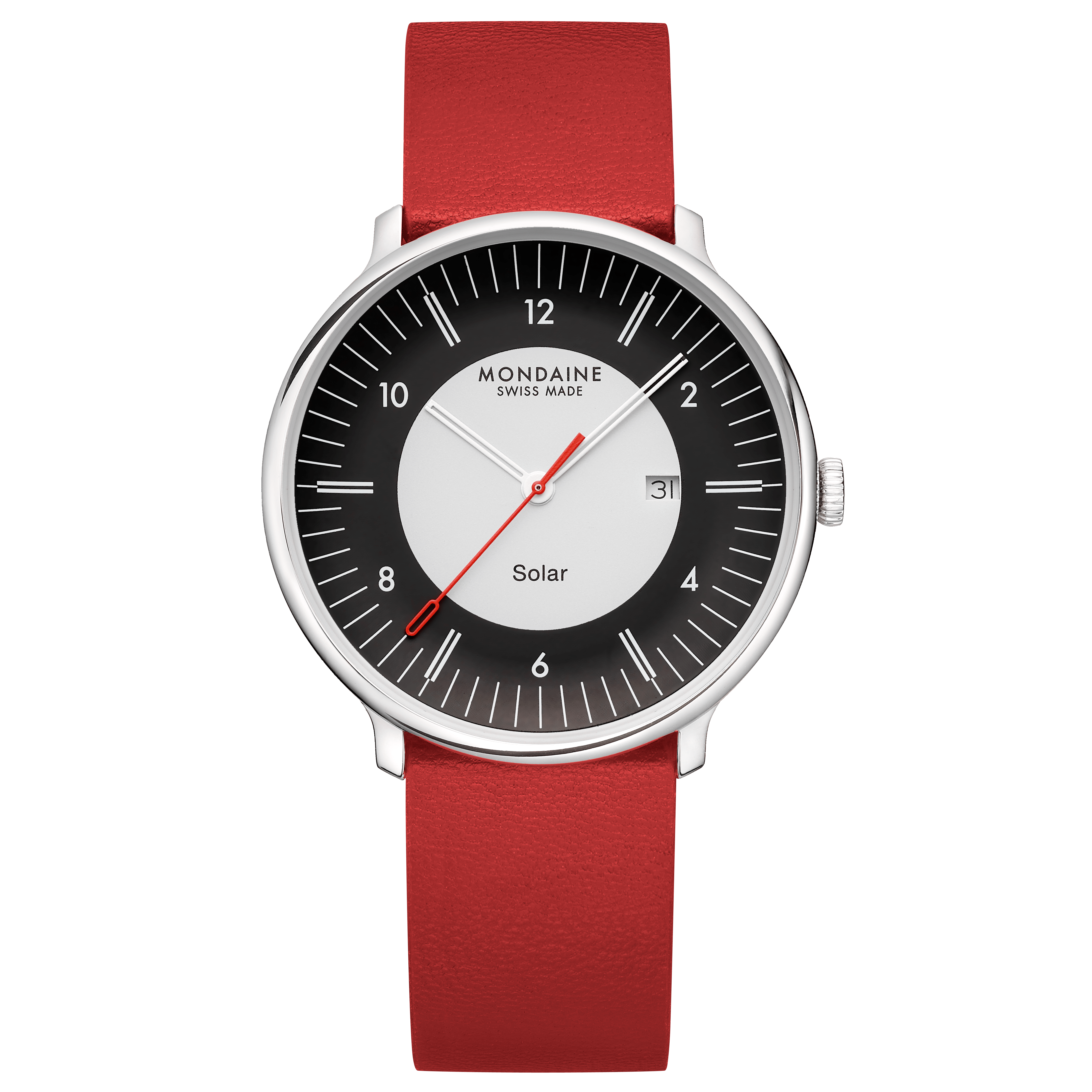 This watch combines timeless Swiss design with forward-thinking innovation. Featuring a 41mm case crafted from 316L stainless steel with up to 91% recycled content, this watch is powered by an innovative solar movement. Beneath the dial, solar cells harness both natural and artificial light, storing energy in a rechargeable battery. This stored energy powers the watch, eliminating the need for regular battery replacements and promoting eco-friendly timekeeping. A fully charged battery can power the watch for approximately 8 months, even without additional exposure to light. The concave dial with a light transparency is paired with a double-domed sapphire crystal creating striking depth and elegance. The design plays with the concept of duality featuring double lines on the hands and indexes and on the tip of the second-hand. The dial also mirrors this with a black outer and off-white inner circle. The date window and water-resistance up to 5 ATM add practical functionality to the timepiece. The black strap is made from organic wine production waste. With its effortless blend of vintage charm and eco-conscious innovation, this timepiece redefines sustainable watchmaking.