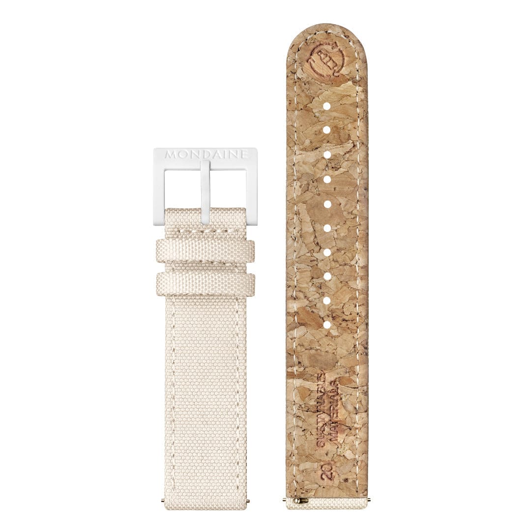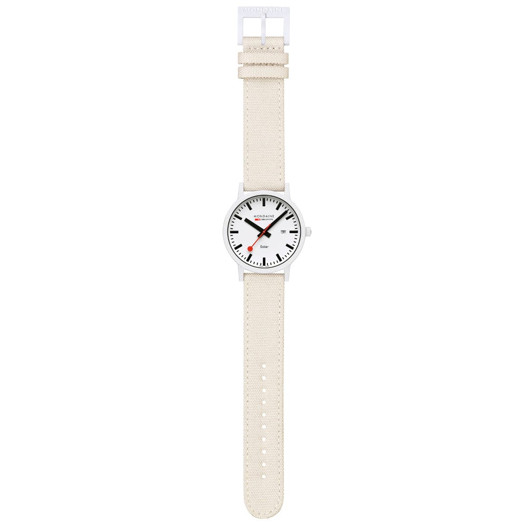 Powered entirely by light, the Mondaine essence solar combines iconic Swiss design with modern sustainability. At its heart beats a Swiss Made Ronda solar movement, charging through any light source and running for up to 8 months even in complete darkness once fully charged. The 41mm case is crafted from a renewable castor oil composite, while the strap is made from recycled PET textile with a natural cork lining for comfort. With its crisp white dial, bold black markers, and the signature red seconds hand, this timepiece is both timeless and forward-thinking — designed to last, responsibly.